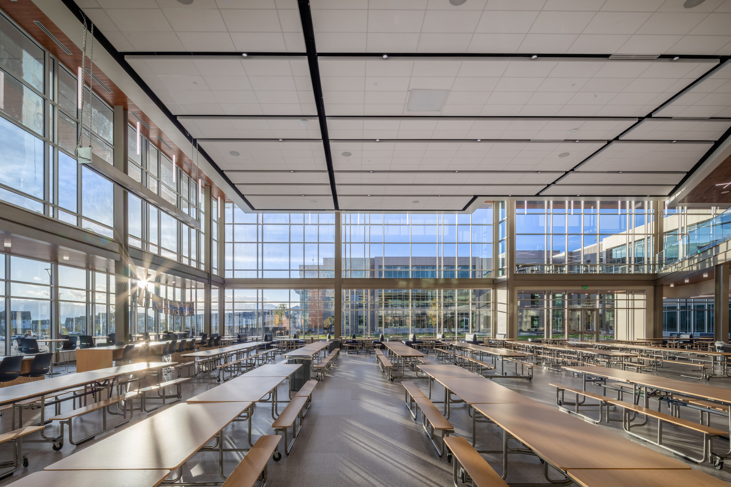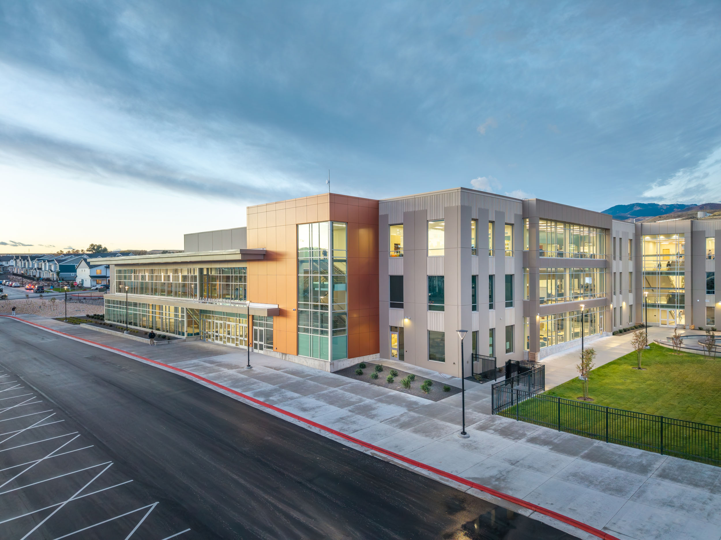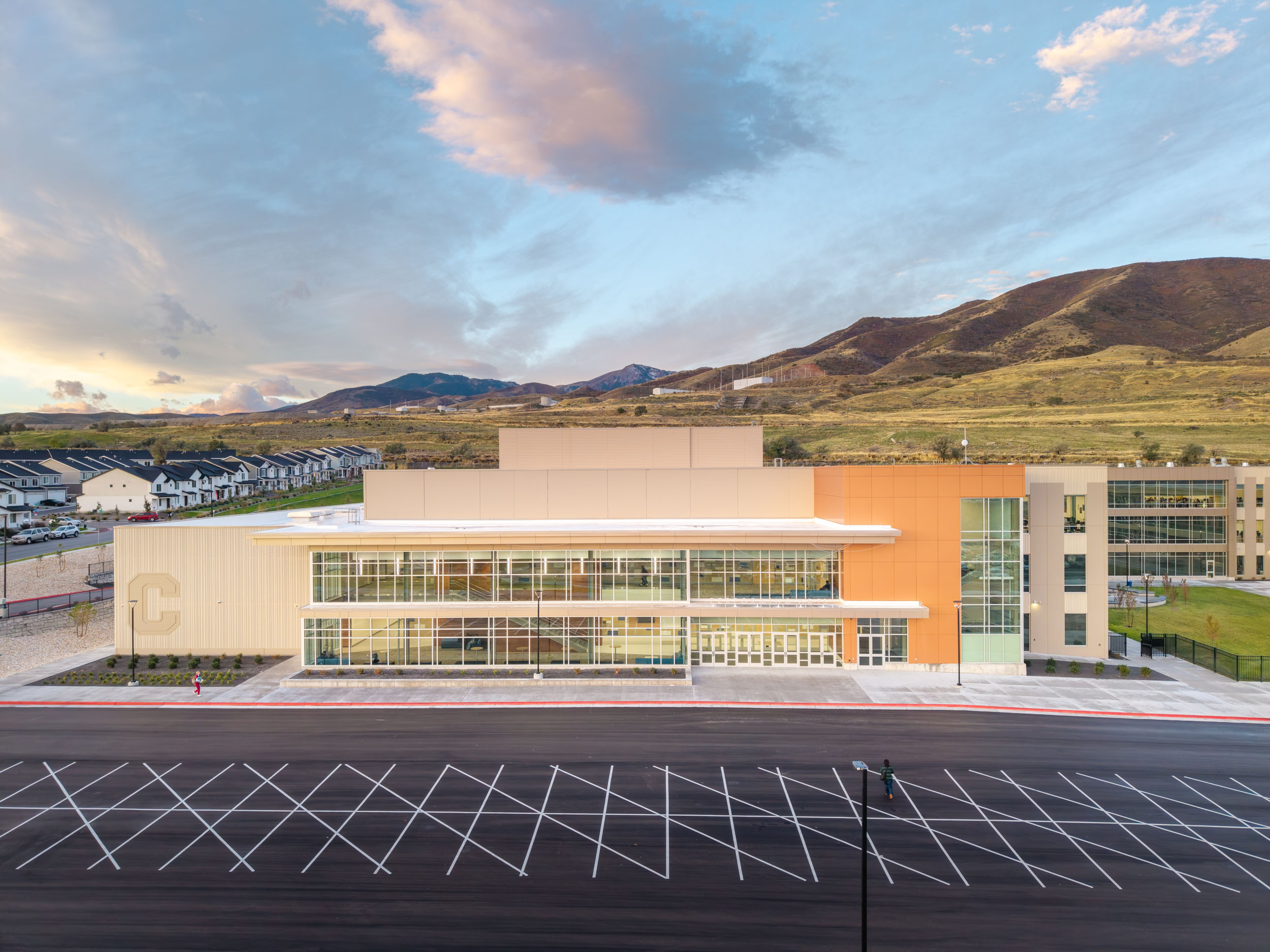 Situated on a new 57-acre site, the 505,000-square-foot facility is Utah's largest comprehensive high school, designed to accommodate over 3,000 students. Academic wings are arranged into flexible learning communities that support collaboration and interdisciplinary teaching. Industry-grade Career and Technical Education (CTE) spaces connect students with real-world skills, preparing them for college and career pathways. The campus also includes a performing arts center, a dedicated teen center, athletic facilities and fields, and an eight-lane natatorium—features that support student development and community use.